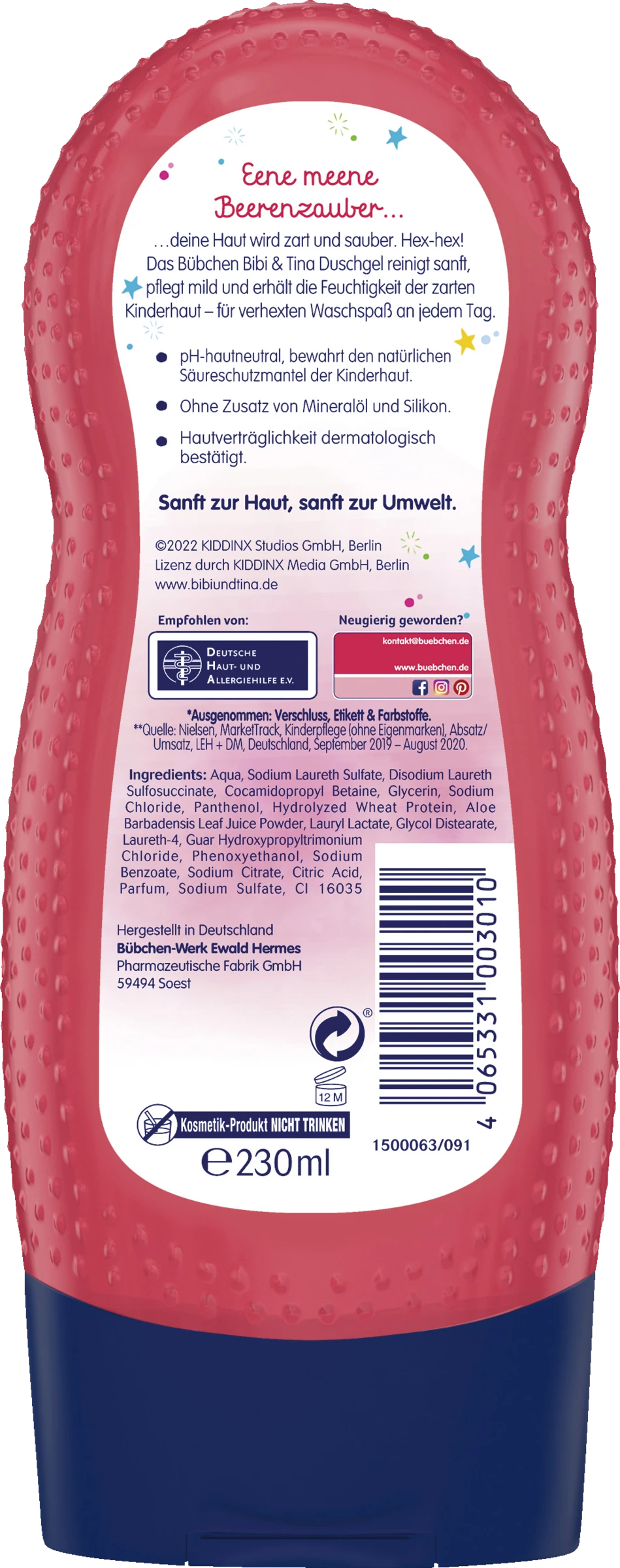 …deine Haut wird zart und Sauber, Hex-hex! Das Bübchen Bibi & Tina Duschgel reinigt sanft, pflegt mild und erhält die Feuchtigkeit der zarten Kinderhaut – für verhexten Waschspaß an jedem Tag.
