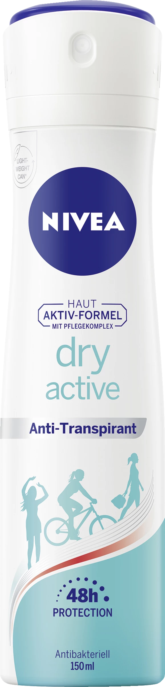 NIVEA Dry Active Spray bietet zuverlässigen Anti-Transpirant-Schutz – 48 Stunden lang. Die hocheffektive Dual-Active-Formel mit zwei besonders wirksamen Anti-Transpirant-Inhaltsstoffen wirkt effektiv gegen Achselnässe, hält die Achseln angenehm trocken und verhindert so unangenehmen Körpergeruch. Das Spray bietet einen femininen, frischen Duft und ist nun als Light-Weight Can in einer nachhaltigeren Dose verfügbar.