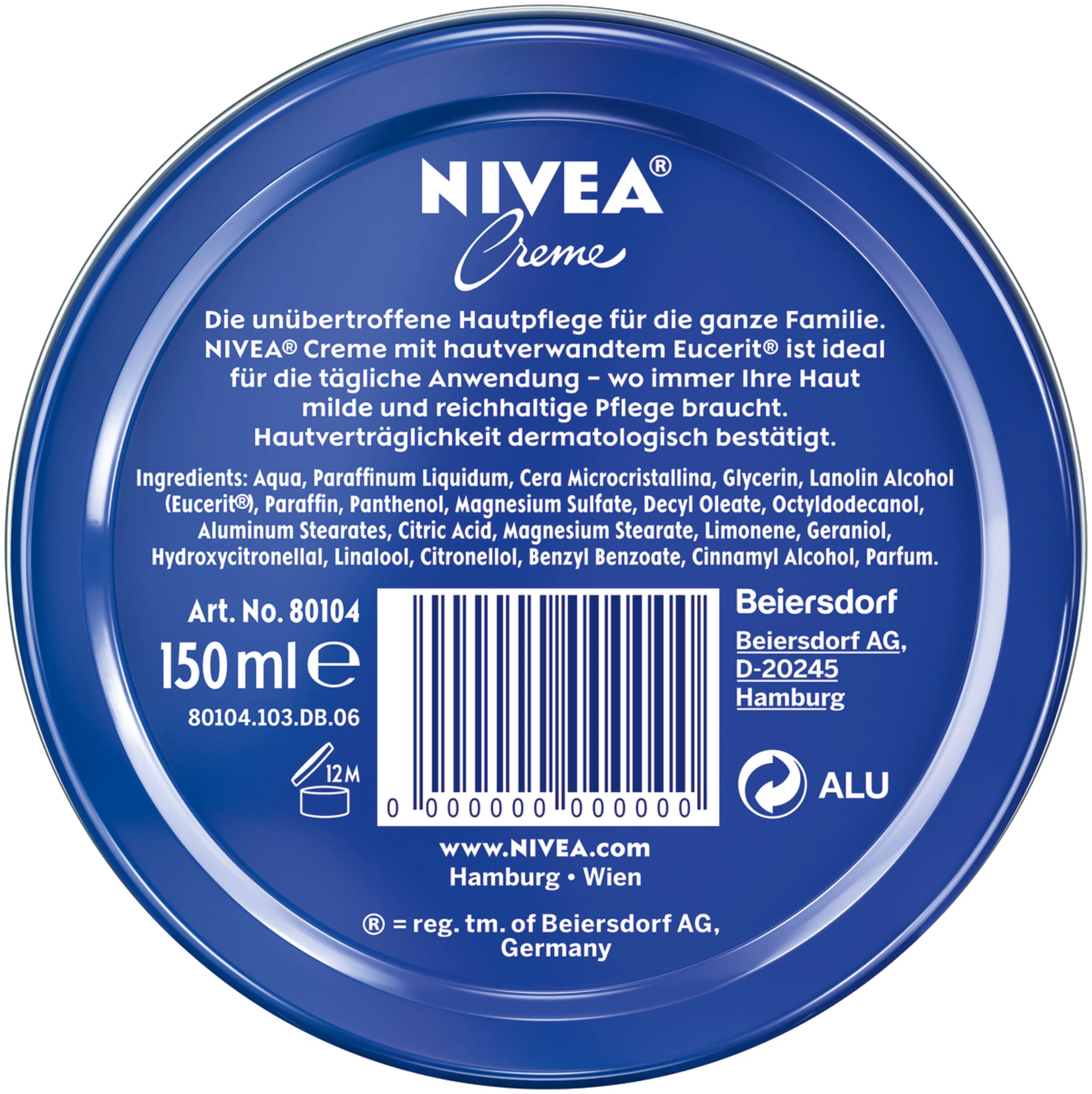 Die unübertroffene Hautpflege für die ganze Familie. NIVEA® Creme mit hautverwandtem Eucerit® ist ideal für die tägliche Anwendung – wo immer Ihre Haut milde und reichhaltige Pflege braucht. Hautverträglichkeit dermatologisch bestätigt.