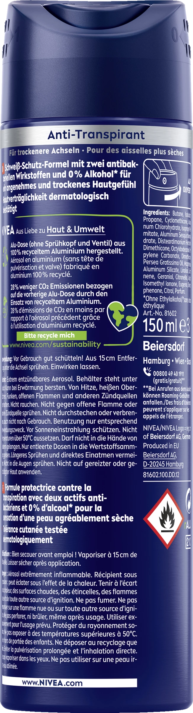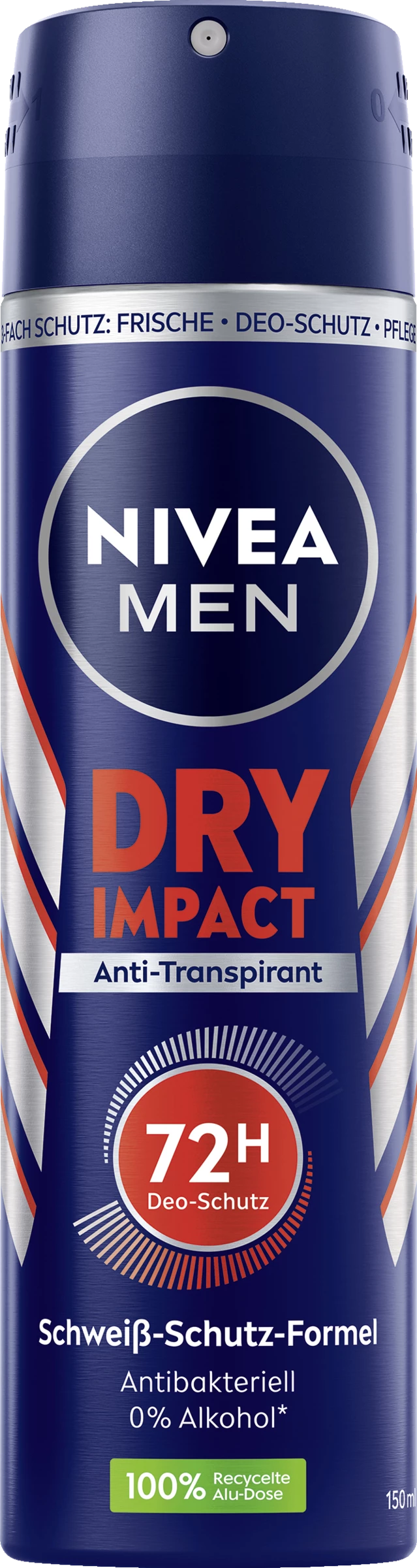 NIVEA MEN Dry Impact Deodorant Spray bietet zuverlässigen Anti-Transpirant-Schutz – 48 Stunden lang. Die hocheffektive Dual-Active-Formel mit zwei besonders wirksamen Anti-Transpirant-Inhaltsstoffen wirkt effektiv gegen Achselnässe, hält die Achseln angenehm trocken und verhindert so unangenehmen Körpergeruch. Das Spray bietet einen maskulinen, frischen Duft und pflegt die Haut. Hautverträglichkeit klinisch bestätigt. NIVEA Men Dry Impact Spray 150 ml.