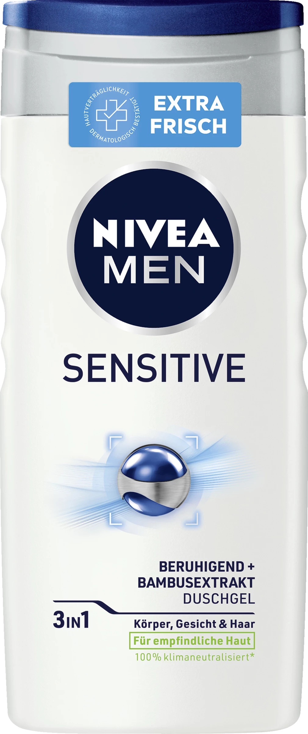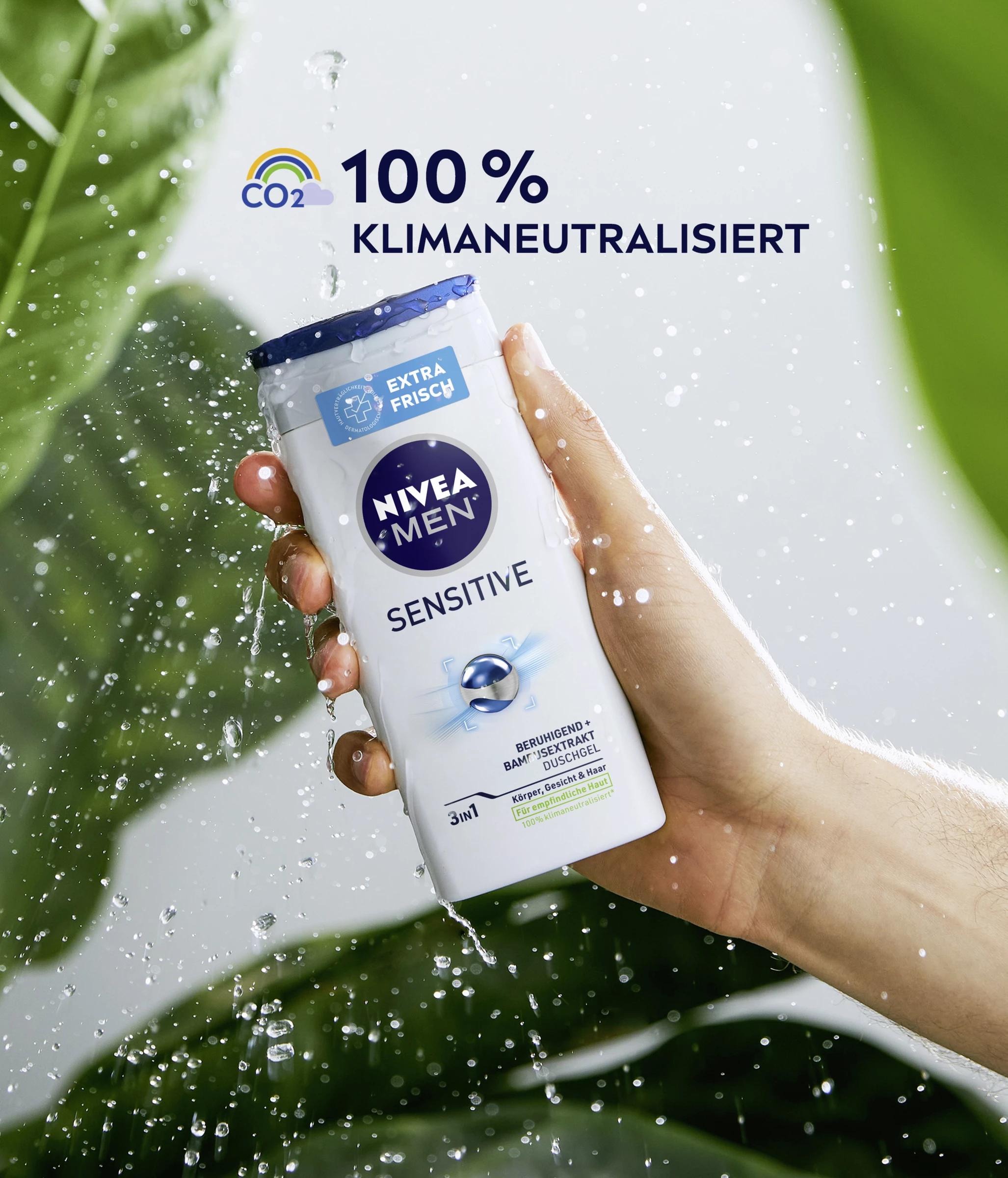 Entdecke milde Erfrischung und optimale Hautpflege mit der NIVEA MEN Sensitive Pflegedusche. Das Duschgel für empfindliche Männerhaut sorgt dank der Formel mit Bambusmilch für langanhaltende Frische und spendet mit der Hydra IQ Technology intensive Feuchtigkeit. Dieses Duschgel ist zu 100% klimaneutralisiert und tut damit nicht nur deiner Haut, sondern auch der Umwelt etwas Gutes: Die Formel ist zu 99% biologisch abbaubar und enthält keine festen Mikroplastik-Partikel. Die Verpackung besteht zu 97% aus Recycling-Material, ohne Label und Verschlusskappe. Für sensible Männer: NIVEA MEN Sensitive Pflegedusche.