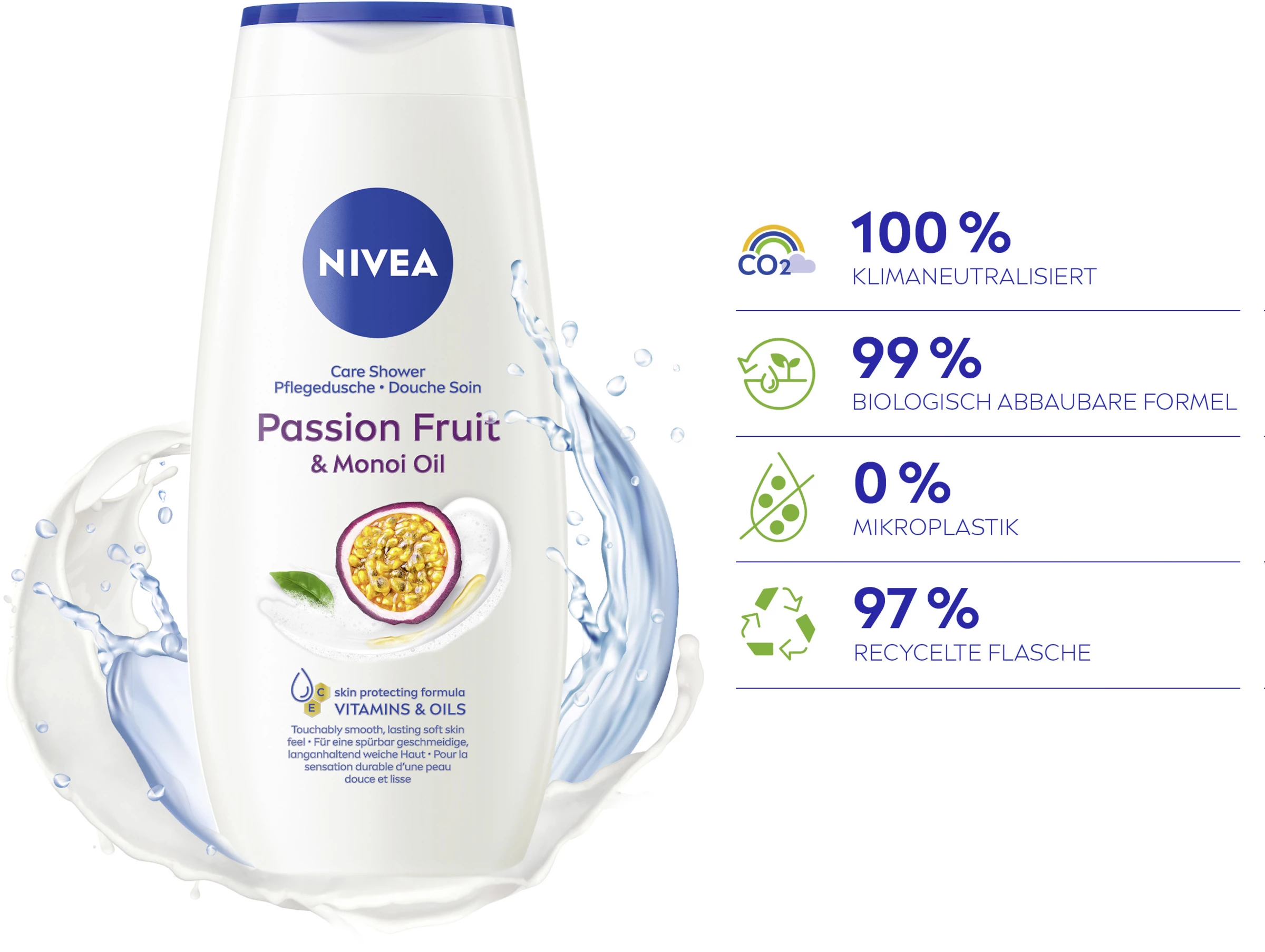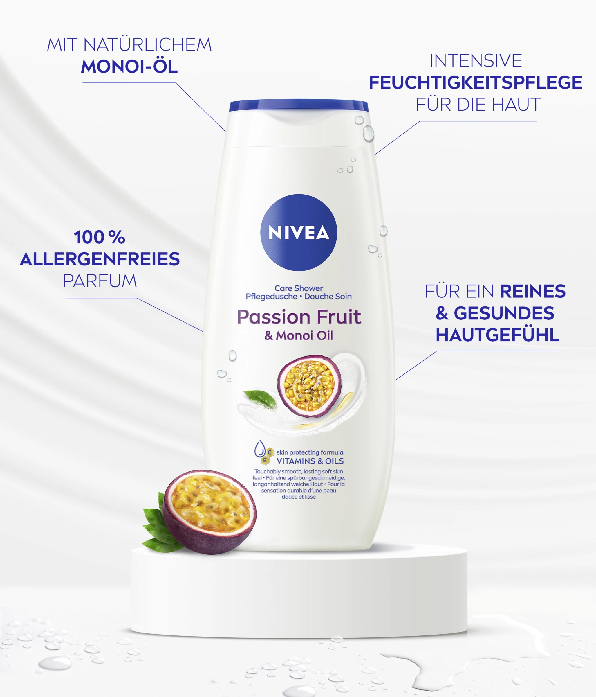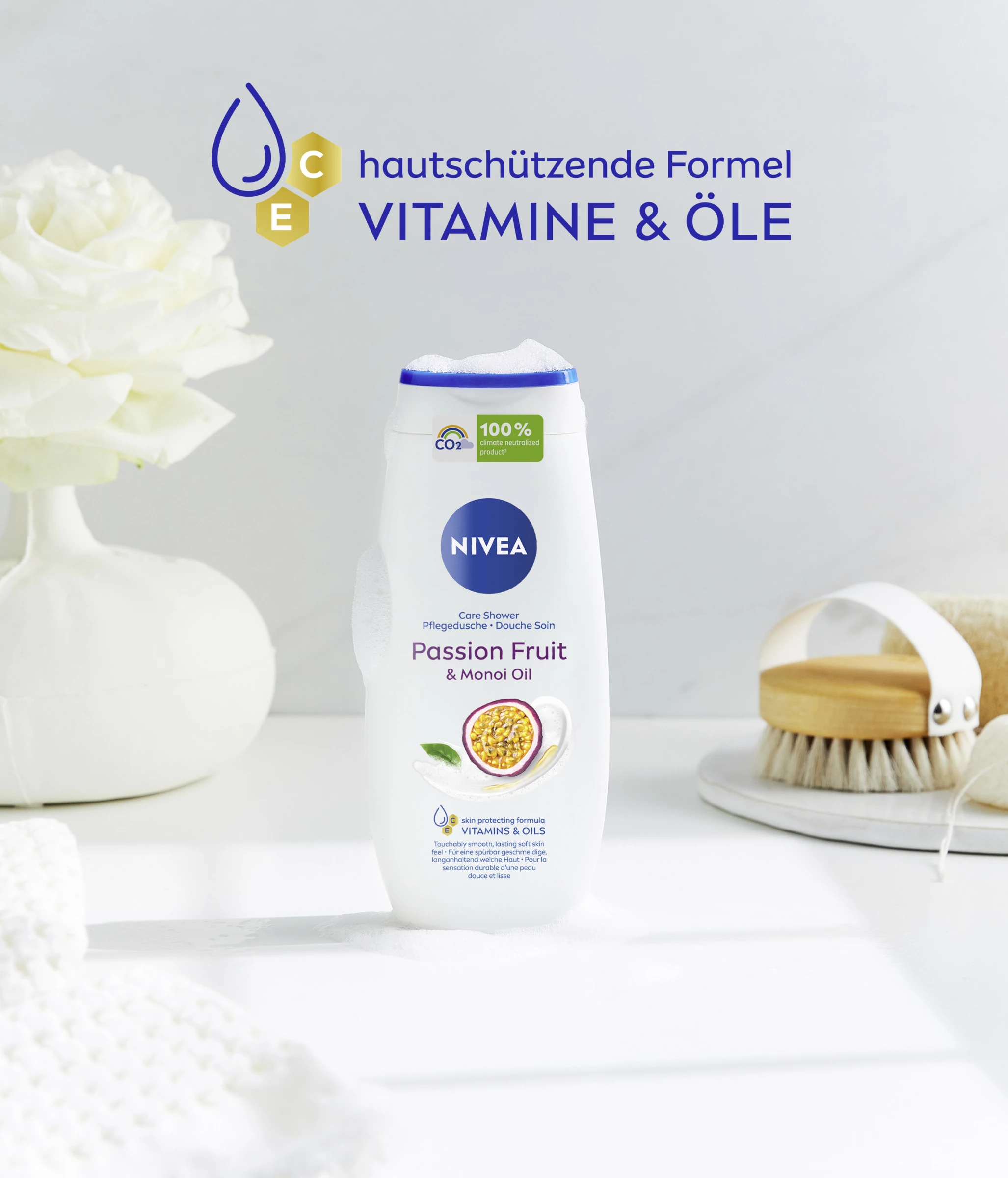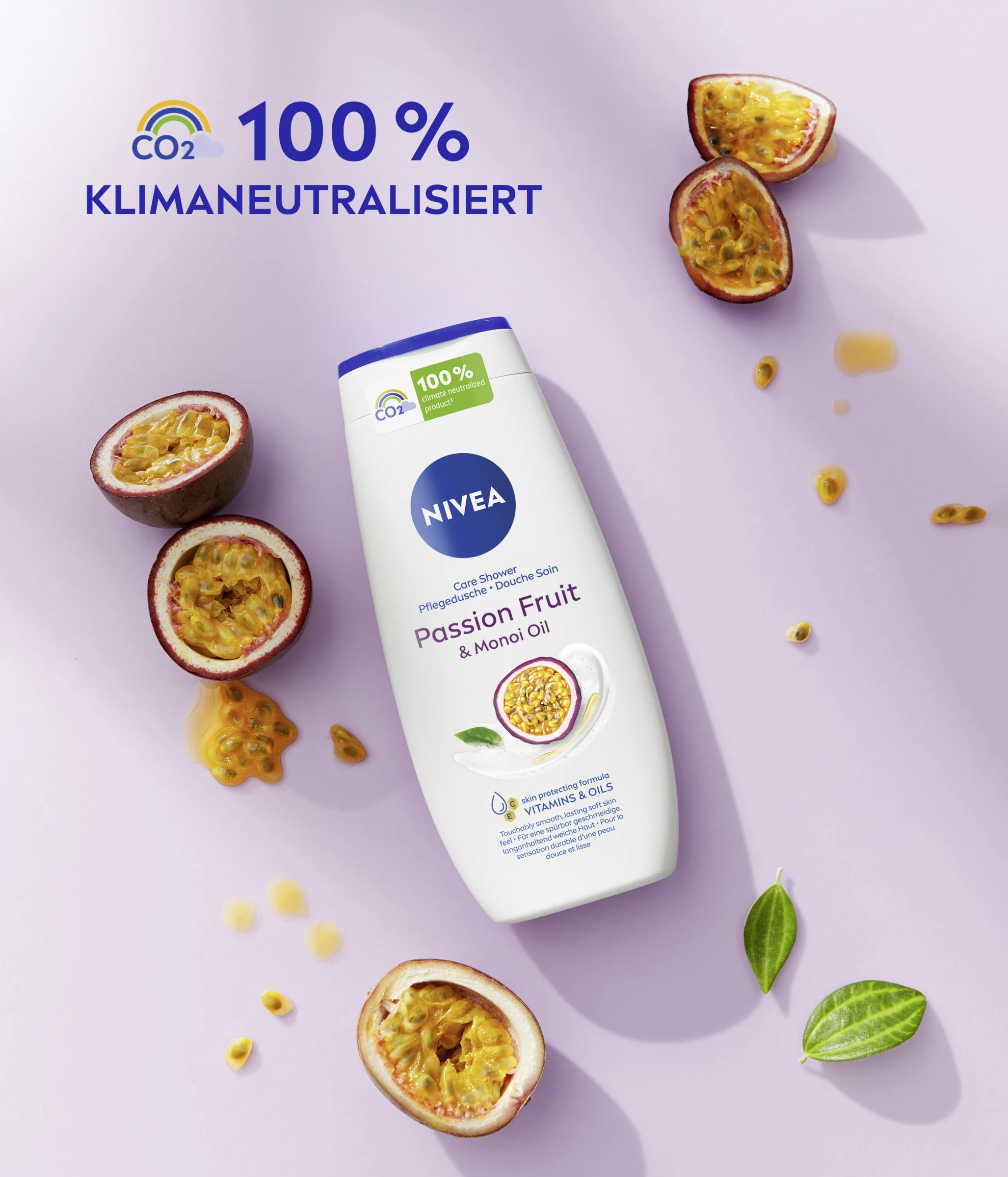 Entdecken Sie ein verwöhnendes Duscherlebnis mit dem cremigen NIVEA Passion Fruit Duschgel. Spüren Sie, wie die seidige Cremedusche Ihre Haut sanft reinigt und ihr dank der Formel mit wertvollem Ölen, Monoi-Öl und Vitamin C & E sanfte Pflege spendet. Genießen Sie den samtweichen Schaum auf Ihrer Haut und den zarten Passion Fruit-Duft, der Ihre Sinne verwöhnt. Dieses Duschgel tut sowohl Ihrer Haut als auch der Umwelt etwas Gutes. Die Formel enthält keine festen Mikroplastik-Partikel und ist zu 98% biologisch abbaubar. Außerdem besteht die Flasche aus 97% Recycling-Material, ohne Label und Verschlusskappe. Für ein geschmeidiges Hautgefühl: NIVEA Pflegedusche Passion Fruit.
