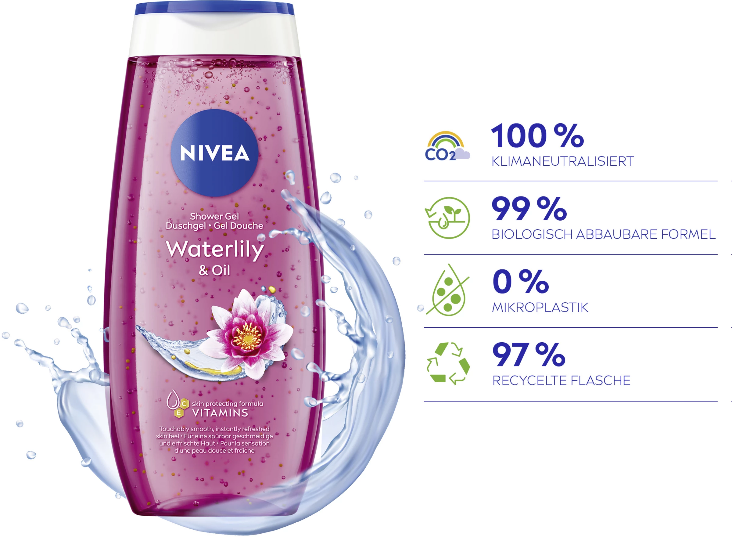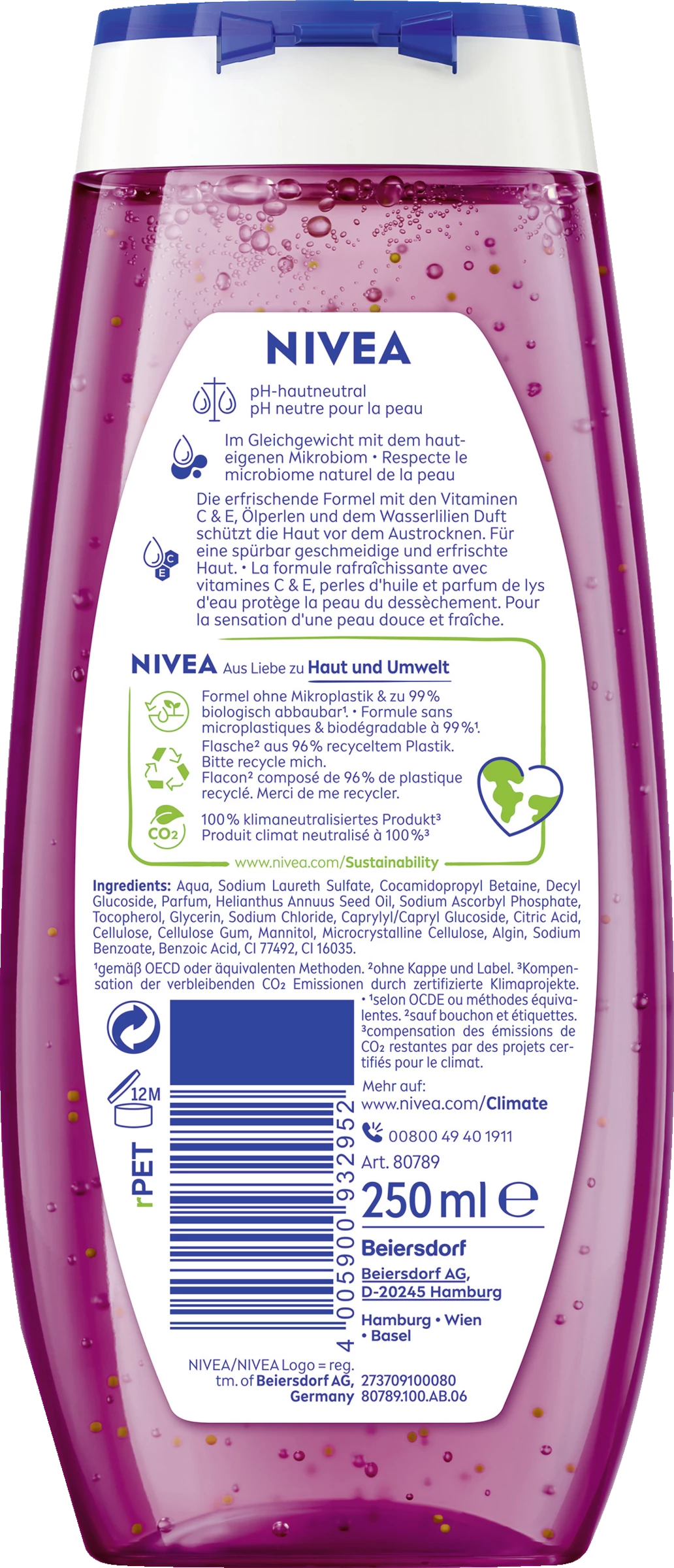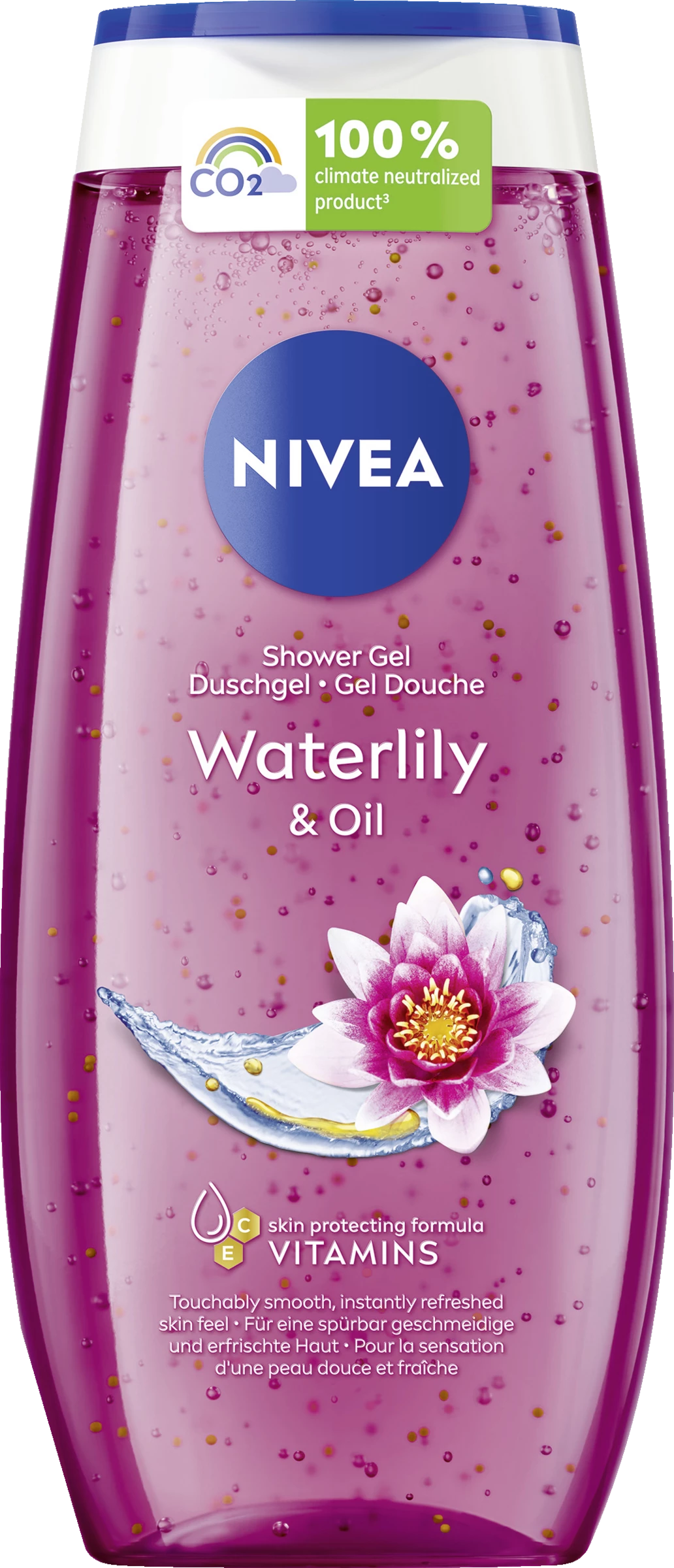 Erleben Sie ein geschmeidiges Hautgefühl mit der NIVEA Waterlily & Oil Pflegedusche. Spüren Sie, wie das erfrischende Duschgel mit Pflegeöl-Perlen, Vitamin C & E und wertvollen Ölen Ihre Haut sanft reinigt und pflegt. Der frische Duft nach Wasserlilie verwöhnt Ihre Sinne unter der Dusche. Dieses Duschgel ist zu 100% klimaneutralisiert und tut damit sowohl Ihrer Haut als auch der Umwelt etwas Gutes: Die Formel enthält kein Mikroplastik und ist zu 99% biologisch abbaubar. Die Verpackung besteht zu 96% aus Recycling-Material, abgesehen von der Verschlusskappe und Label. Verwandeln Sie jedes Duscherlebnis in einen verwöhnenden Pflegemoment mit NIVEA: Waterlily & Oil Pflegedusche.