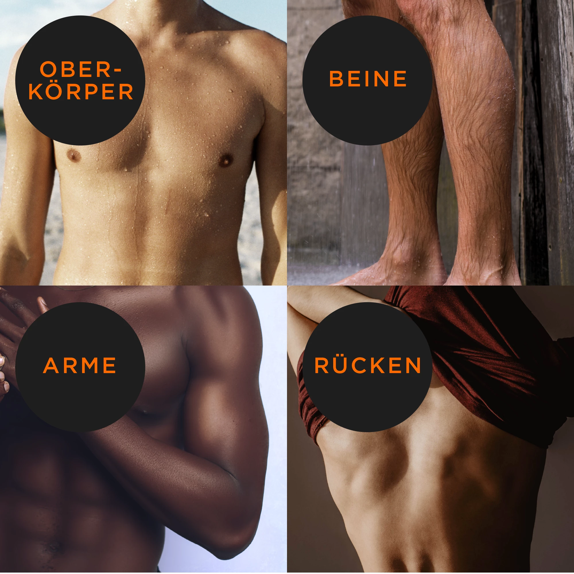 Vor Anwendung alle wichtigen Hinweise lesen und befolgen. Gebrauchsanweisung beachten. Insgesamt nicht länger als 10 Minuten einwirken lassen. NICHT GEEIGNET für Kopf, Gesicht, Augen, Nase, Ohren, Anal- oder Genitialbereich sowie Brustwarzen. NICHT VERWENDEN auf Krampfadern, Narben, Muttermalen, bei pickliger, geschädigter, gereizter Haut, Sonnenbrand oder bei vorangegangenen Hautreaktionen auf Enthaarungs-Creme. Warten Sie immer 72 Stunden bis zur nächsten Enthaarung. Bei Einnahme von Medikamenten, die die Haut beeinflussen können, bei Hautkrankheiten oder sonstigen Beschwerden, die Auswirkungen auf die Haut haben, vor der Anwendung einen Arzt konsultieren. FÜHREN SIE vor jeder Anwendung EINEN HAUTTEST DURCH, indem Sie das Produkt auf einer kleinen Stelle der zu enthaarenden Körperregion nach Gebrauchsanweisung anwenden. Wenn nach 24 STUNDEN keine Hautreaktionen auftreten, können Sie mit der Enthaarung fortfahren. Bei Brennen/Prickeln während der Anwendung, das Produkt sofort entfernen und die Haut gründlich mit kaltem Wasser abspülen. Wenn das Brennen anhält, ärztlichen Rat einholen. Nach der Enthaarung kann die Haut für kurze Zeit empfindlicher sein, vermeiden Sie daher, sich zu kratzen. Nach der Haarentfernung empfehlen wir 24 Stunden zu warten, bevor Sie Deos oder parfümierte Produkte auftragen, schwimmen gehen, ein Sonnenbad nehmen oder Bräunungsgeräte bzw. -creme verwenden. NICHT IN DER REICHWEITE VON KINDERN AUFBEWAHREN. Bei Verschlucken sofort einen Arzt aufsuchen und Packung vorzeigen. Kontakt mit den Augen vermeiden. Im Falle von Berührung mit den Augen sofort mit viel Wasser spülen und einen Arzt aufsuchen. Enthält Alkali. Enthält Salze der Thioglycolsäure. Das Produkt kann Oberflächen rutschig machen. Kontakt mit Teppichen, Kleidung und Fußböden vermeiden.