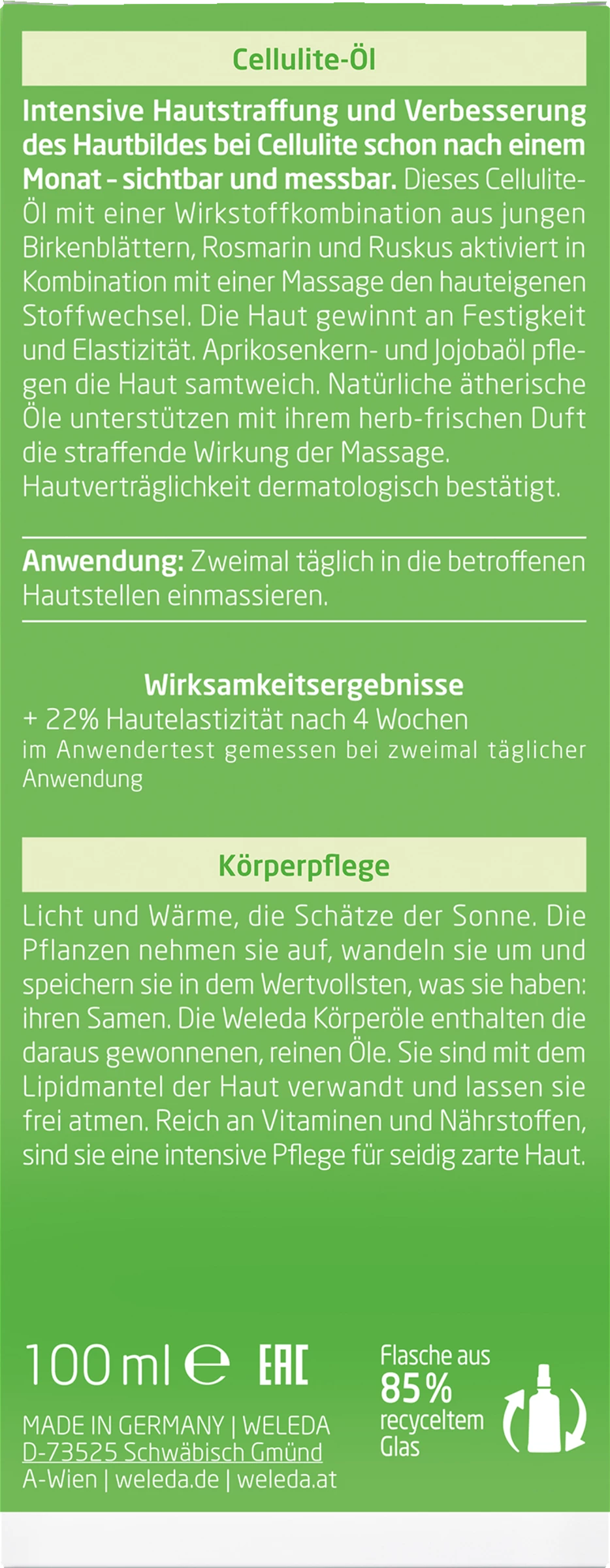 Das Birke Cellulite-Öl verleiht Ihrer Haut neue Spannkraft, macht sie glatter, straffer und verwöhnt mit einem herb-frischen Duft. Das 100 ml Birke Cellulite-Öl jetzt mit Spender.